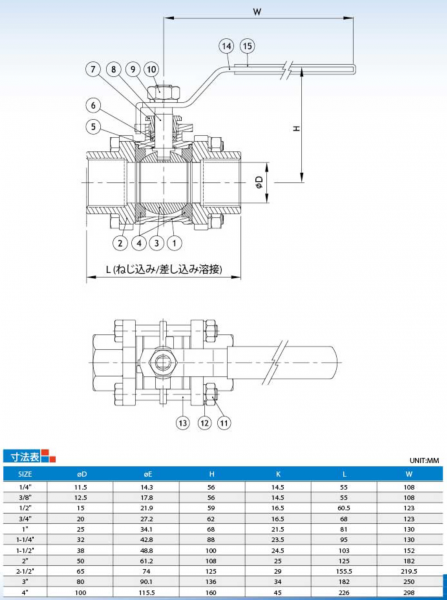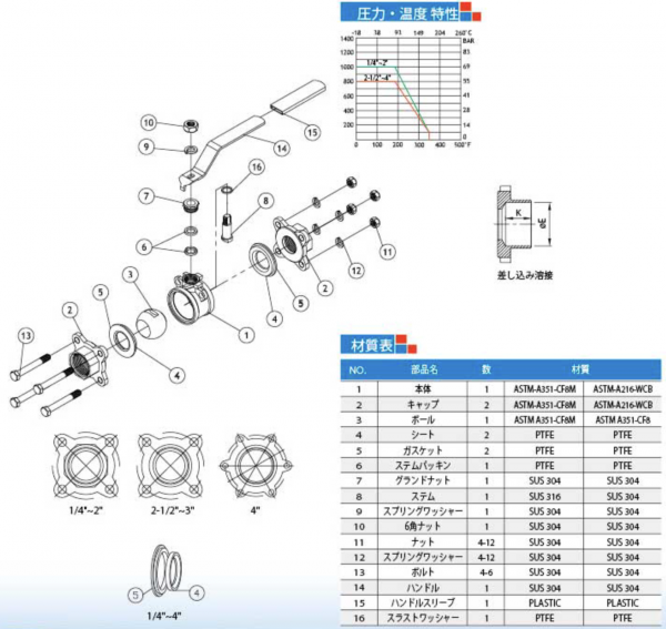 圧力規格:1/4"~2" 1000WOG/PN63、2-1/2"~4" 800WOG/PN40