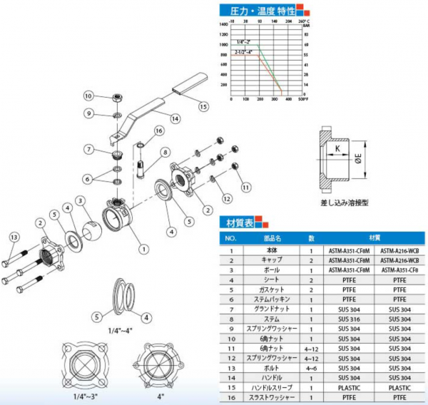 圧力規格:1000WOG(1/4"~2")、800WOG(2-1/2"~4")